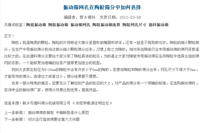 我公司于2012年3月8日發(fā)表了《振動篩網(wǎng)孔在陶粒篩分中如何選擇》的一篇新聞。如下圖: