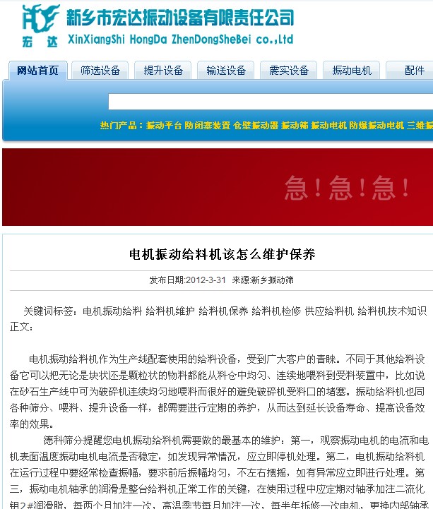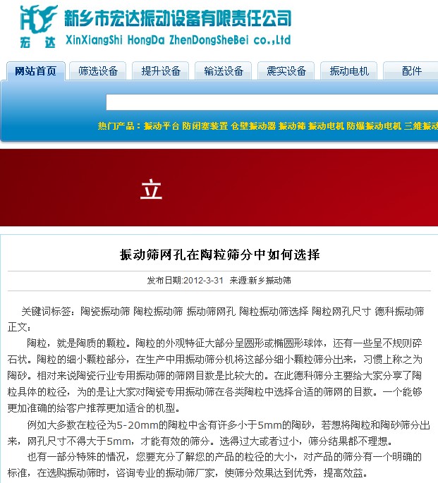 悲劇的全抄襲發(fā)生在2012年3月31日,由宏達(dá)振動在其公司網(wǎng)站下發(fā)表同樣名稱的新聞,請看關(guān)鍵詞,赫然的德科篩分作為了他們新聞的關(guān)鍵詞。正文中提到“在此德科篩分主要給大家分享了陶粒具體的粒徑”,請看宏達(dá)網(wǎng)站的截圖。這種抄襲太拙劣了,毫無自己的思維。同日,低劣的全抄襲不僅僅為這一篇。德科不反對技術(shù)分享,但請在您分享的基礎(chǔ)上尊重自己和同行。